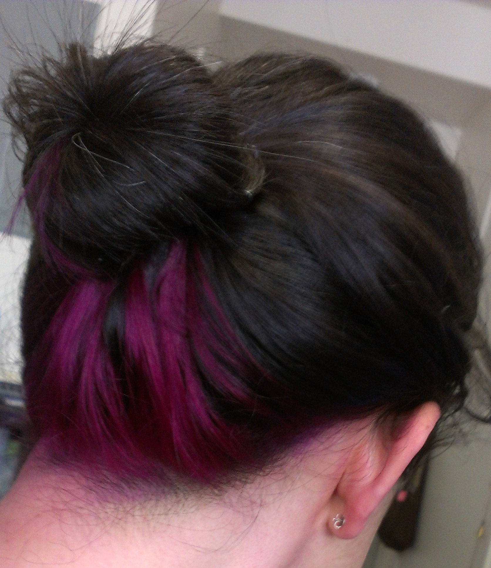 When my hair is down it peeks out just a bit, but when it’s pulled up it shows much more brightly. The color changes a bit with the light. Sometimes it’s much more purple and sometimes it’s quite pink.